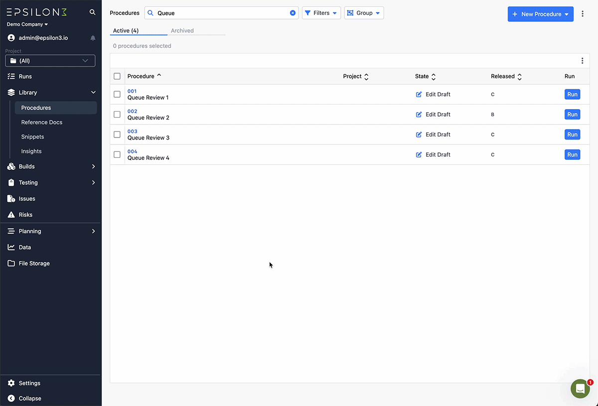 Users can use the “Queue for Review” action in the procedures list to create a queue of procedure drafts. The queue will automatically navigate the user to the next procedure draft in the queue after the current procedure draft has been released or deleted.