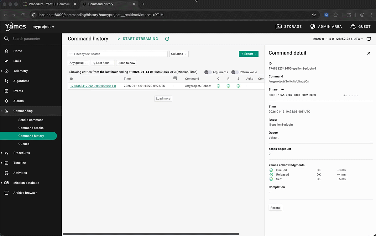 Our Epsilon3 YAMCS plugin, as of version v1.1.2, now also includes support for sending commands to YAMCS from Epsilon3 runs.