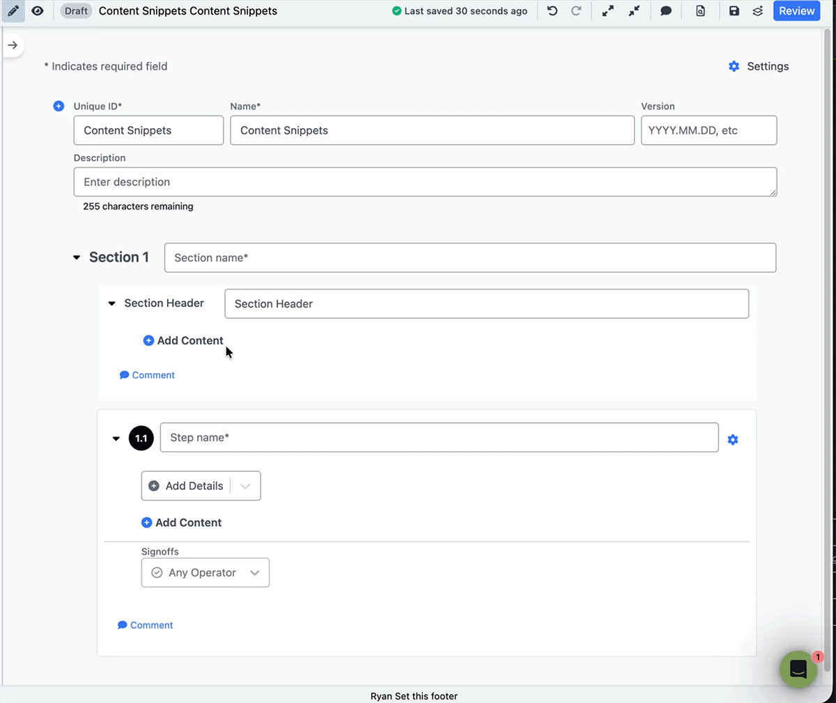 Users can now create reusable content snippets to use as prebuilt content blocks in procedure headers and step content.